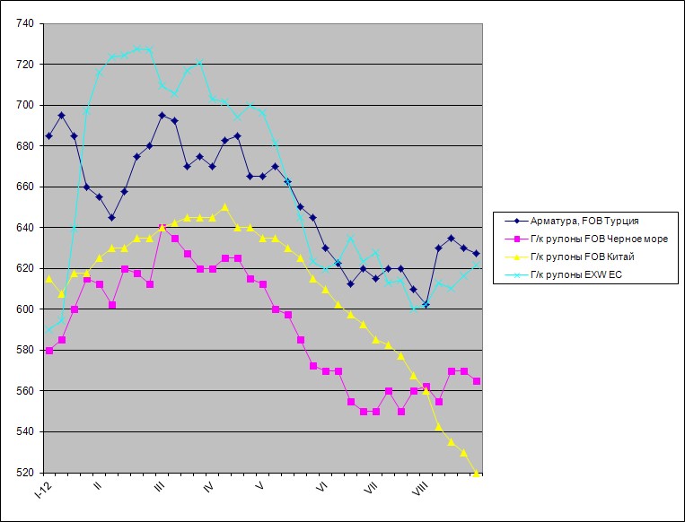 Тем не менее, рост цен на турецкую арматуру оказался кратковременным. За первую половину августа турецкие компании подняли экспортные котировки от $600-610 до $625-645 за т FOB, но затем были вынуждены снова убавить цены на $10-20 за т. В большинстве стран Ближнего Востока ни экономика в целом, ни строительная отрасль в частности не демонстрируют признаков близкого ускорения роста. Очевидно, в ближайшие месяцы региональные цены на длинномерный прокат будут определяться состоянием рынка Саудовской Аравии с его регулируемыми ценами. Таким образом, предельный уровень цен на турецкую арматуру в размере $640-650 за т FOB, скорее всего, в обозримом будущем не будет превзойден.