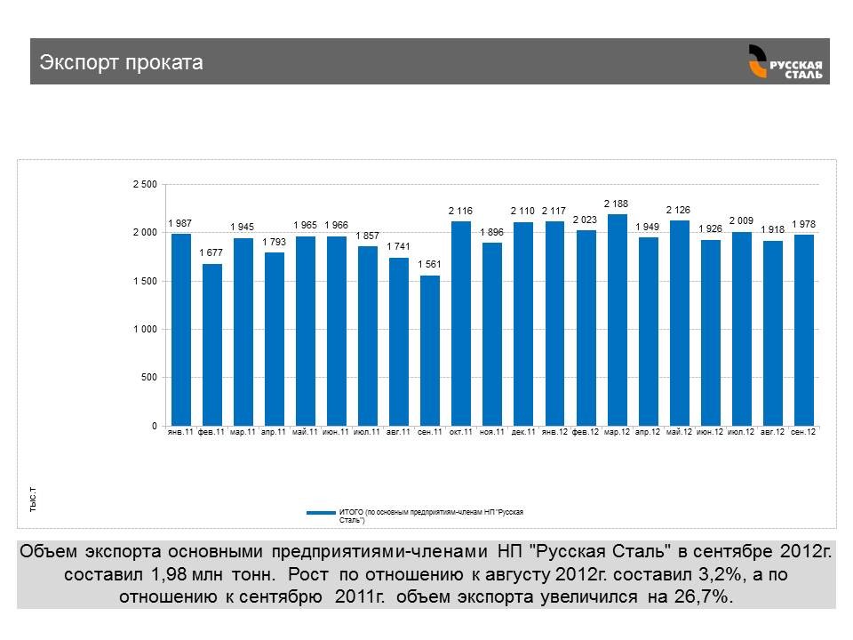 Основные предприятия-члены НП «Русская Сталь» в сентябре 2012 г. произвели 4,89 млн тонн готового проката, что на 13% больше, чем в сентябре 2011 г. и на 0,1% по сравнению с августом 2012 г. За 9 месяцев 2012 г. производство готового проката выросло на 6,2% по сравнению с аналогичным периодом прошлого года – до 42,57 млн тонн.