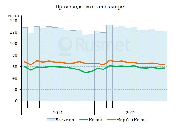 Правда, в последний год лидерам также пришлось снизить темпы роста. В Китае, по данным Worldsteel, в 2012 году было произведено 708,8 млн. т стали, что всего на 3,7% больше, чем в предыдущем году. Это самый низкий показатель, начиная с 2000 года. Китайская металлургическая ассоциация CISA приводит несколько другие данные – 716,5 млн. т и 3,1%, но результаты все равно выглядят достаточно однозначными. Из-за ослабления национального рынка – прежде всего, в строительстве и ориентированных на экспорт отраслях промышленности – потребление стальной продукции в стране увеличивается медленнее, чем раньше. При этом, существенного улучшения в ближайшем будущем не ожидается. По прогнозам CISA, в 2013 году спрос на сталь в стране возрастет только на 3,1%. Опрос экспертов, организованный информационным агентством Reuters, показал, что специалисты предсказывают на текущий год 4,5%-ный рост производства стали в стране (до 746,5 млн. т).