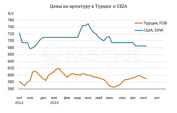 В конце августа – начале сентября стоимость турецкой арматуры на американском рынке составляла около $600-605 за т CFR, тогда как местные производители продавали аналогичную продукцию по $670-700 за метрическую т EXW. Эти цены оставались практически неизменными на протяжении всего лета – прежде всего, из-за слабого спроса со стороны национальной строительной отрасли. Надежды на повышение котировок в сентябре были достаточно слабыми, хотя теперь, возможно, американским металлургам удастся добиться некоторого роста.